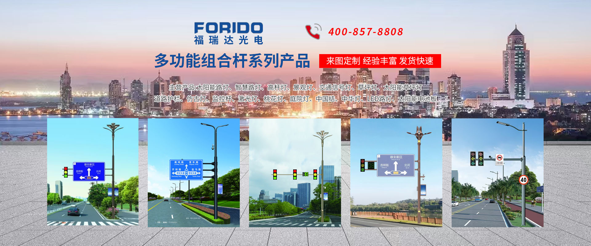 揚(yáng)州福瑞達(dá)光電科技有限公司位于淮左名都?xì)v史文化名城、中國(guó)路燈制造基地?fù)P州市北郊菱塘工業(yè)園,公司占地面積76000平方米,注冊(cè)資金10518萬(wàn)元,擁有高級(jí)技術(shù)嫻熟的員工280多人,擁有大型折彎?rùn)C(jī)、激光切割、數(shù)控注塑機(jī)、壓鑄機(jī)、自動(dòng)埋弧焊、氣焊、彩色粉末靜電噴塑等大型自動(dòng)化設(shè)備,我公司是一家集設(shè)計(jì)、研發(fā)、生產(chǎn)、銷(xiāo)售、施工安裝服務(wù)為一體的戶(hù)外交通照明產(chǎn)品制造商,主要生產(chǎn)智慧路燈、太陽(yáng)能路燈、LED路燈、高桿燈、景觀燈、交通信號(hào)燈、交通標(biāo)志牌、通信鐵塔、路跨鋼結(jié)構(gòu)、公交站臺(tái)、太陽(yáng)能光伏組件、景點(diǎn)亮化、樓宇亮化工程的設(shè)計(jì)施工等。公司秉承開(kāi)拓創(chuàng)新、銳意進(jìn)取、精誠(chéng)服務(wù)的企業(yè)精神,堅(jiān)持以“誠(chéng)信為本、技術(shù)為先、服務(wù)是金”的合作理念,我們憑借先進(jìn)的制造工藝、優(yōu)質(zhì)的產(chǎn)品質(zhì)量、合理的市場(chǎng)價(jià)格和完善的售后服務(wù)贏得了廣闊的市場(chǎng)和客戶(hù)的信賴(lài)。 我公司已通過(guò)ISO9001質(zhì)量體系認(rèn)證、ISO14001環(huán)境管理體認(rèn)證,CQC產(chǎn)品認(rèn)證,中國(guó)節(jié)能產(chǎn)品認(rèn)證,通過(guò)“CCC”強(qiáng)制性產(chǎn)品認(rèn)證,具有市政總承包,照明,交安,設(shè)計(jì)等資質(zhì)···